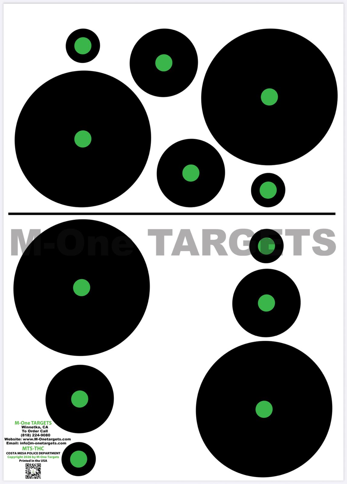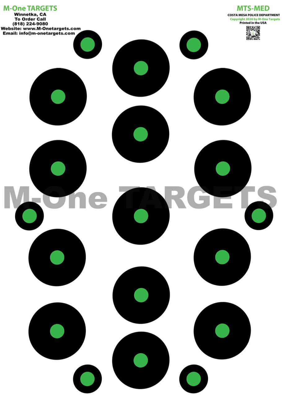 M-One TARGETS are suitable for both beginners and professional level shooters. They are printed in the U.S.A. on high-quality paper using green ink, which is easier for the eye to pick up than any other color. Instructors use our targets to help students with muscle memory and target acquisition. Professional shooters use our targets to go back to the basics of sight acquisition mechanics for fine-tuning. Our targets take the frustration out of shooting, making the process easier. Our targets eliminate the need for shooters to retrieve their targets after each shot to see the placement. They are easily visible in low-light indoor range conditions and are not washed out in outdoor shooting conditions. Our targets provide shooters with the advantage they need for efficient and safe shooting.