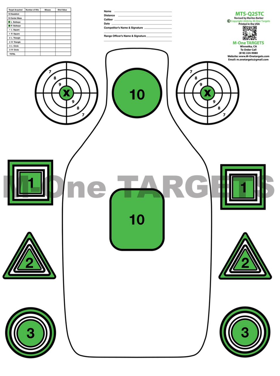 The MTS-Q2STC target “Human Bottle Image” target is designed to improve muscle memory and target acquisition. It includes specific zones for the head and center mass, with a green rectangle highlighting the critical upper torso area, as well as six peripheral targets. This target is well-suited for practicing stoppage drills with a variety of firearms and is suitable for individuals of all skill levels.