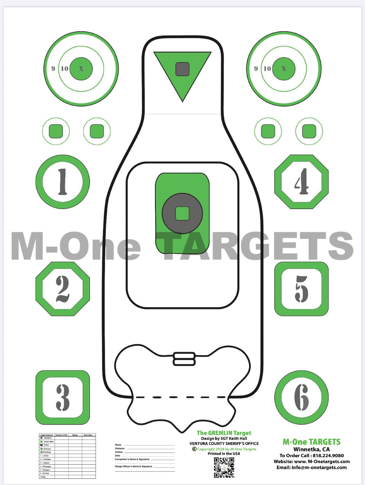 The Gremlin was developed for all firearm drills and skill levels to hone fundamentals or advanced tactical training. It provides a body target to improve muscle memory and target acquisition with specific zones for the head, center mass, and pelvis along with a green rectangle highlighting the critical upper thoracic area. It also has six peripheral call targets along with bullseye and MOA target zones* (full size 35”x24” target only). This target is well-suited for practicing stoppage drill, precision shooting, or zeroing red dot sights with a variety of firearms. Its multiple target zones allow more time shooting and fewer trips downrange to replace targets. Perfect for law enforcement, military, competitive shooters, self-defense training, and firearms instructors.